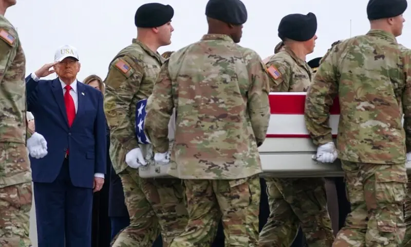 بین القوامی ذرائع ابلاغ کے مطابق صدر ٹرمپ سفید رنگ کی ’یو ایس اے‘ تحریر والی بیس بال کیپ پہنے ہوئے تھے اور انہوں نے اس وقت سلامی دی جب فوجی اہلکار امریکی پرچم میں لپٹے تابوتوں کو فوجی طیارے سے اتار کر باہر لے جا رہے تھے۔ ڈوور ایئر فورس بیس وہ مقام ہے جہاں بیرون ملک ہلاک ہونے والے امریکی فوجیوں کی میتیں سب سے پہلے امریکا لائی جاتی ہیں۔
