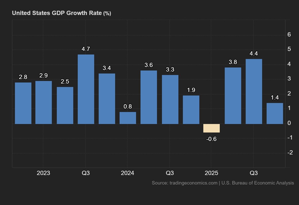 1.4% was less than half the consensus of about 3% and less than a third of Q3 2025’s unexpectedly positive 4.4%. Consumer spending continued to grow last quarter but at a slower pace while government spending obviously contracted significantly due to the shutdown in October. Exports contracted slightly in Q4 after having grown very strongly the quarter before.